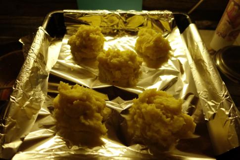 Es dauert etwas länger als auch schon, dann wird endlich ein Nachtessen serviert. Es gibt gefüllte Pouletbrüstchen, Penne mit hausgemachter Tomatensauce, dazu feine Kartoffelpuffer aus dem Ofen.