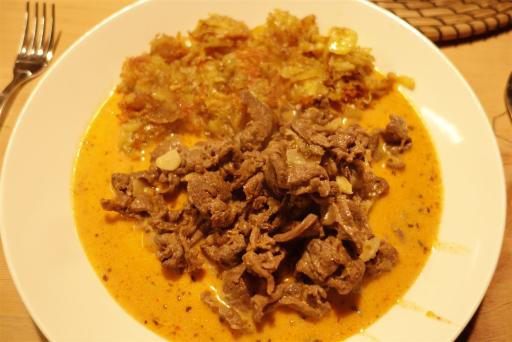 Ivo hat ein weiters Mal in der Küche gezaubert: Rentiergeschnetzeltes und eine selbstgeraffelte, wunderbar knusprige Rösti. Dazu noch den letzten Rest vom äusserst feinen Shiraz des Vorabends.