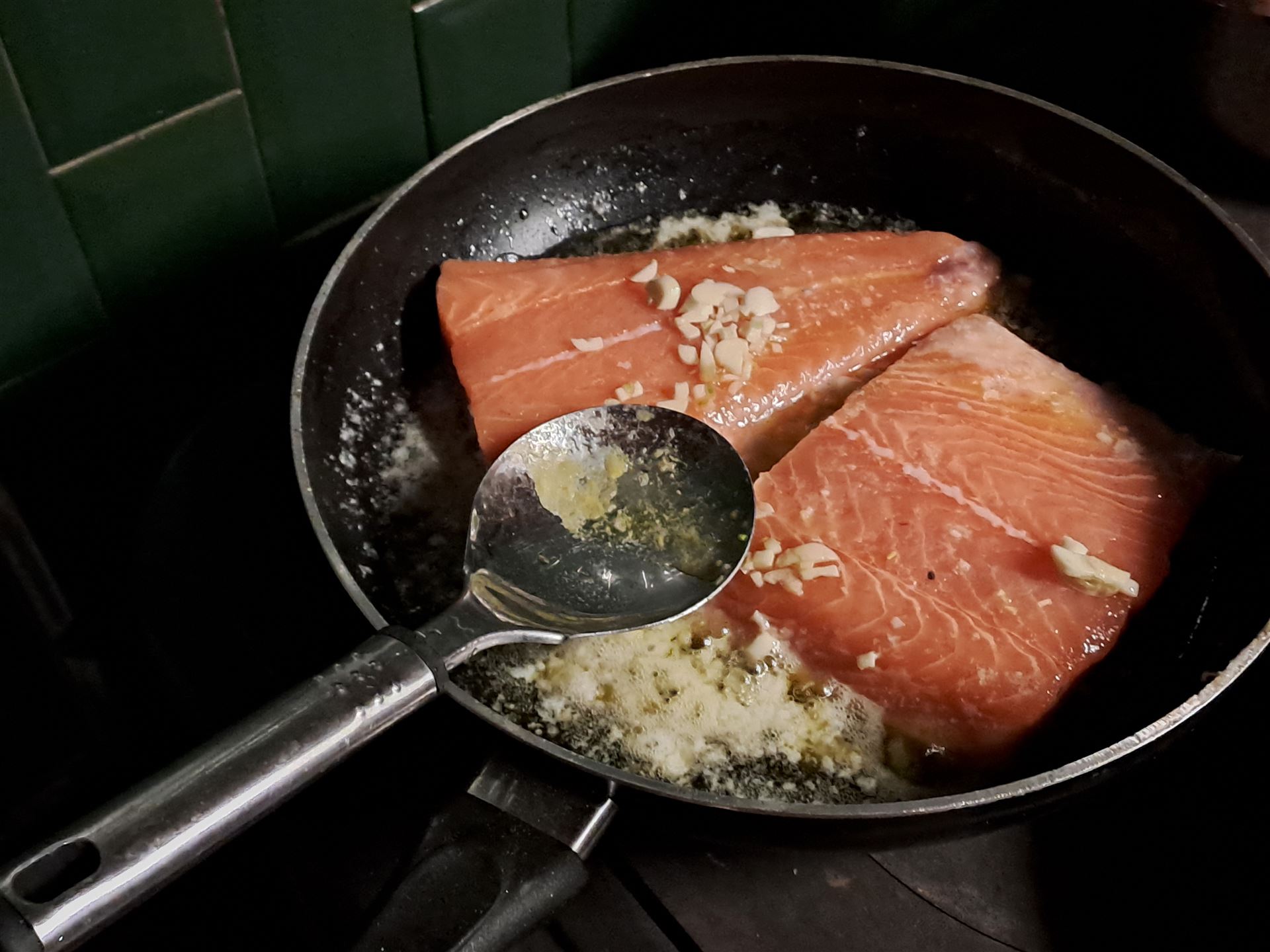 Zum Auftakt gibt es immer frischen Lachs, in Knoblauch und Butter gegrillt, akkurat gegart, wie es sich gehört. Dazu ein leckeres Sößchen, Reis mit Zwiebeln und frischem Lauch – bodenständig, ehrlich, kompromisslos gut.