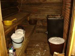 Eine Wohlfühl-Sauna will jeden Tag aufs Neue vorbereitet sein. Das sind jeden Tag ca. 25 kg Schnee den wir anschleppen, für die Katzenwäsche. Und eine Unmenge an Holz, damit wir den Ofen zum glühen und die Temperatur nach oben bringen. |