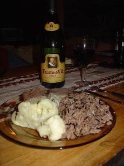 Wir wollten uns nicht Lumpen lassen und haben uns für Tinu ein feines Essen ausgedacht. Ein Rindschmorbraten an einer Bernaisesauce mit ein wenig Wildreis angereichert, mit etwas Rotwein und dazu noch Blumenkohl. Anscheinend schmeckte es allen, den Koch freuts! |