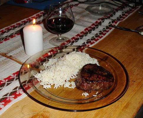 Unser erstes Nachtessen in Kelohovi. Rindsfilet mit Reis und eine feine Flasche spanischer Rotwein (Sangre de Toro). mmm... |