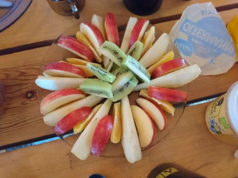 Tom unser Master-Früchte-Schnippler zauberte schon am ersten Tag eine Tellerplatte voll wunderbar geschnittenen frischen Früchten. Das kompensierte das etwas spärliche Frühstück, da unsere grosser Einkauf ja noch anstand.