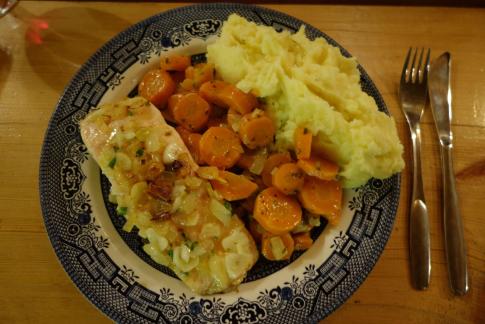 Kartoffelpüree und Kartotten angeschwizt in Zwiebeln und Knoblauch garnieren den Lachs auf dem Teller, welcher in Butter mit Knoblauch angebraten wurde. Dazu verköstigten wir einen herrlichen Rotwein namens "Matua". Ein vorzüglicher Pinot Noir.
