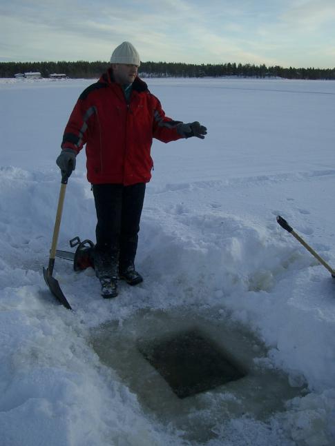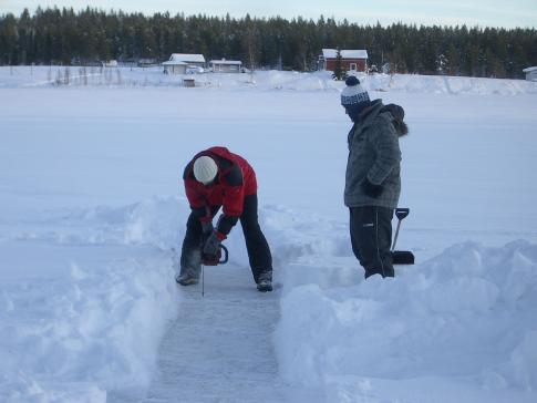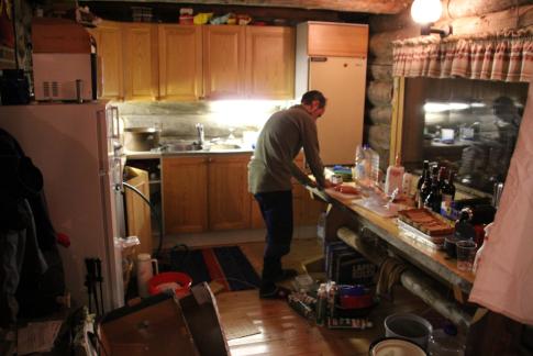 Back in Kelohovi, gings dann los... Es schien als hätten sich die Lappland-Trolle gegen uns verschworen, um uns das Leben ein wenig zu erschweren. Als erstes wollten wir mit unseren neuen Schläuchen das Wasserproblem zu lösen. Aufgrund der Länge der Leitung und abnehmenden Druckes begann das Wasser im Schlauch zu gefrieren. Diese Übung brachen wir dann relativ bald ab, um uns der nächsten Herausvorderung zu stellen. Der Ablauf in der Küche funktionierte nicht mehr. Nachdem Sanitär Ivo das gesamte Rohrsystem demontiert hatte, fanden wir heraus, dass der Ablauf vereist war. Nun gings daran das Eis zu schmelzen. Also feuerten wir aus allen Rohren: die Elektrosauna im Nebenraum auf 100 Grad, die Hütte auf 30 Grad heizen und mit kochendem Wasser direkt in den Ablauf.  |