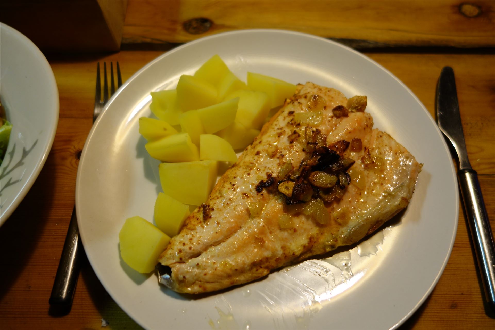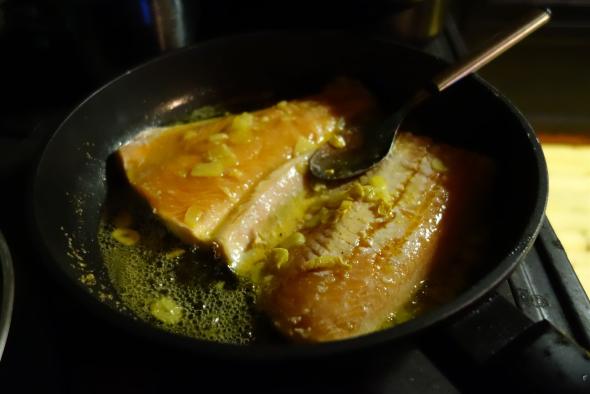 Das erste Essen beginnen wir immer mit einem Klassiker. Ein frischer Lachs, geschwenkt in Knoblauchbutter.