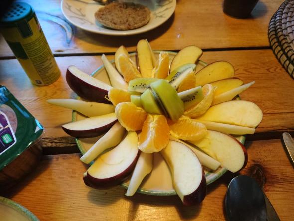 Auch Tom weiss was zu tun ist. Der schnitzt schon am ersten Morgen einen Vitamin-Früchteteller so wie es sich zu jedem Frühstück gehört.