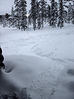 Vom Holzschopf halten wir uns ein wenig links. Hier zur nächsten Geraden Richtung Sauna. Der Schnee wird immer tiefer... |