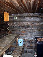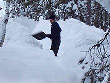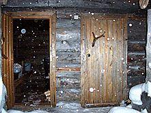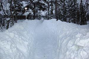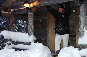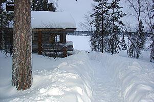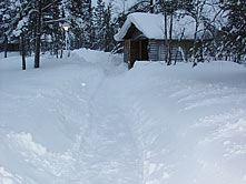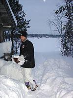 Dann haben wir es geschafft. Links die Sauna und weiter geradeaus der Salankijärvi. Ja diesen ganzen Weg haben wir mit 2 Schaufeln freigeschaufelt. Wir kennen nix (määschiiin)!! Ivo füllt unsere Wasserkübel in der Sauna mit frischem Schnee. |
