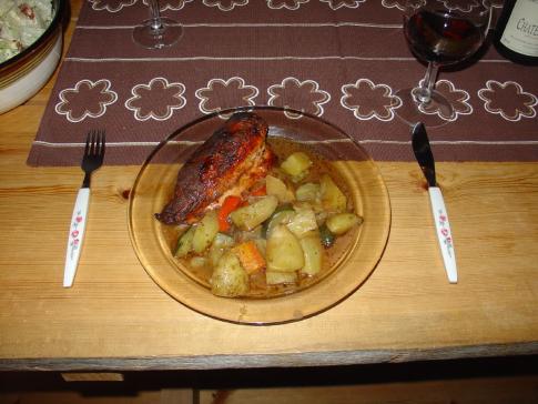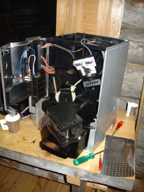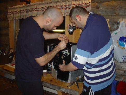 Back in Kelohovi zauberte Ivo uns einen feinen Flughund auf den Teller: Poulet, Rüebli und Kartoffeln und ein Salötli mit gebratenem Speck...mmm. Dazu ein entsprechender Rotwein. Wir haben ja schliesslich Kultur hier draussen im Wald. Leider mussten wir jetzt auf Filterkaffee umsteigen, da unsere Jura-Kaffeemaschine den Geist aufgegeben hat. Servicetechniker Ivo mit Assistent MacMac versuchten alles, leider ohne Erfolg. |