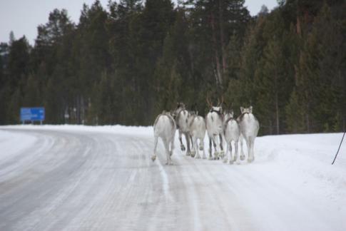 Unsere Köpfe waren heute morgen wie das Wetter, noch leicht bewölkt, der Abend hat Spuren hinterlassen... Auf dem Weg zurück nach Kelohovi trafen wir wieder Familie Rentier. Tinu fand dann auf seiner 1:800000 Strassenkarte ein Abkürzung. Wir haben dann tatsächlich den Weg erheblich abgekürzt, was uns aber etwa gleich viel Zeit gekostet hat. |