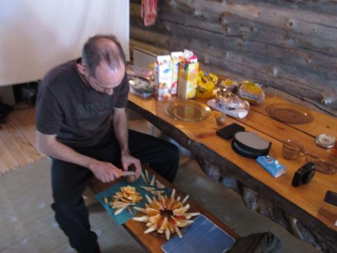 Ein üppiges Frühstück erwartet uns nach dem jeder der Kelohovis aber so was von ausgeschlafen ist. Wie immer schnippelt Tom bereits wieder am obligaten Obstteller der das Kernstück unseres Frühstück ist.
