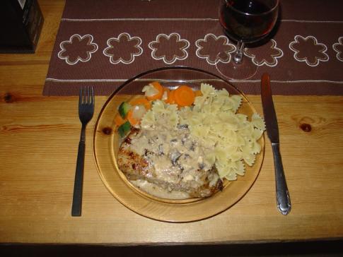 Vor dem Essen lief im Kelohovi-Kino noch "Burn after reading" von den Gebrüdern Coen. Zum Abendessen zauberte unser Chef de Cuisine ein saftiges Schweinsfilet vom Grill mit verschiedenen Gemüse und Pasta. Dazu gab es spanischen Rotwein aus dem Beutel. |