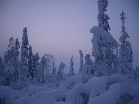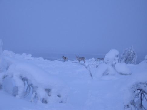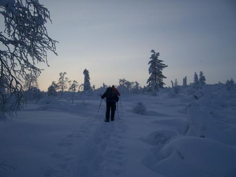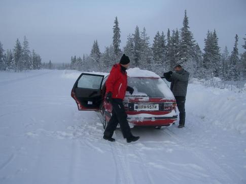 Nach kurzer Fahrt durch das unendliche Weiss des läppischen Hochlandes erhielten Roger und Dani eine kurze Einführung ins Schneeschuhlaufen durch den Yeti-Master Tinu. Kurz darauf ging es dann auch schon los. Rauf auf den Berg, durch unberührte Schneefelder, zwischen Bäumen hindurch und wieder runter zu einem gefrorenen See. |