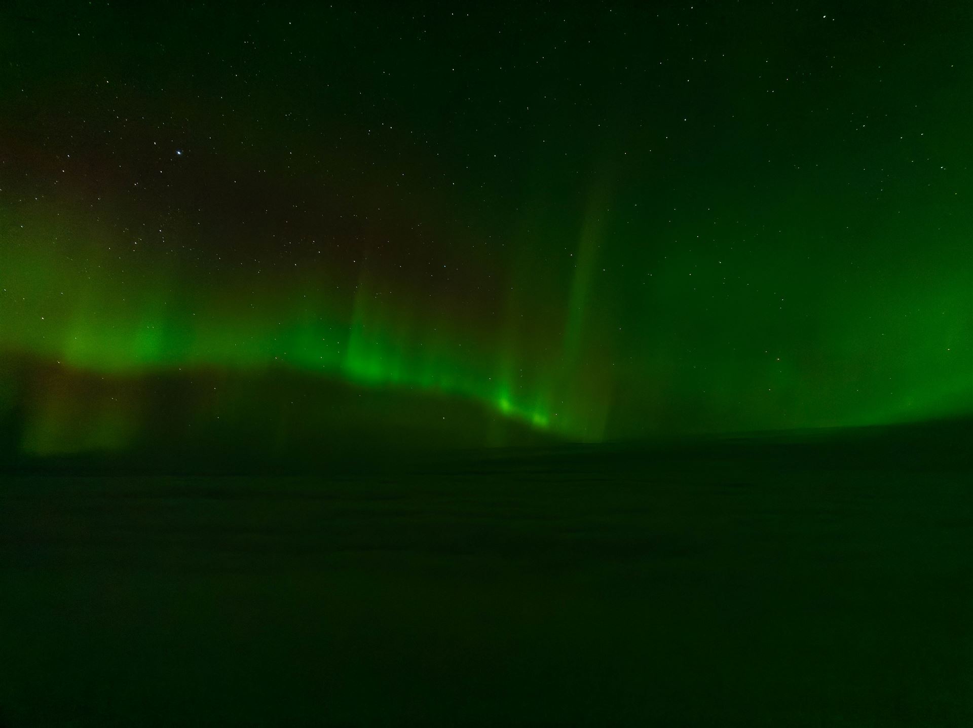 Und siehe da: Über der Nebelsuppe spielt sich ein völlig anderes Spektakel ab! Das schönste Nordlicht flimmert dort oben am Himmel, während wir hier unten nur in Grau gehüllt sind.
