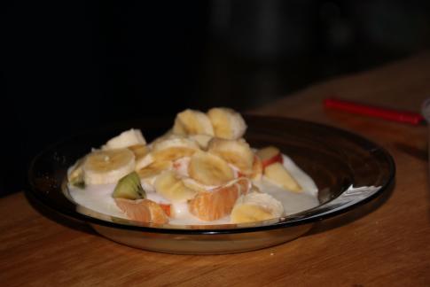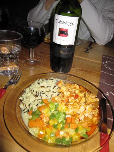 Heute wurde es asiatisch, Poulet Süss-Sauer mit gerösteten Cashewnüssen, dazu Wildreis und Gemüse Julienne (5 Arten). Dazu ein Glas Mineral für Roger und eine Flasche Cabernet Sauvignon aus Chile für die übrigen. Abgerundet wurde das Abendessen durch einen frischen Tomaten-Gurken-Salat. |