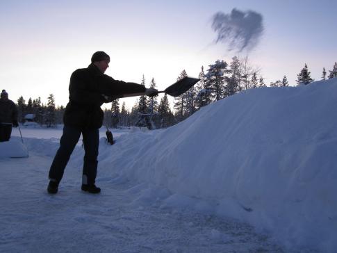 Dann ging es daran das Curlingfeld weiter auszubauen und zu optimieren. Das Feld nimmt jetzt bereits schon Olympische Masse an. Auf Grund des vielen Schnees, welchen wir vom gefrorenen See abgetragen haben entstand ein Nebenschauplatz. Ein rund 2 Meter hoher Schneehügel entstand. Es ist noch nicht ganz klar, ob daraus ein Iglu oder eine Schneebar entstehen wird, auf jeden Fall geht uns so die Arbeit nicht aus. |