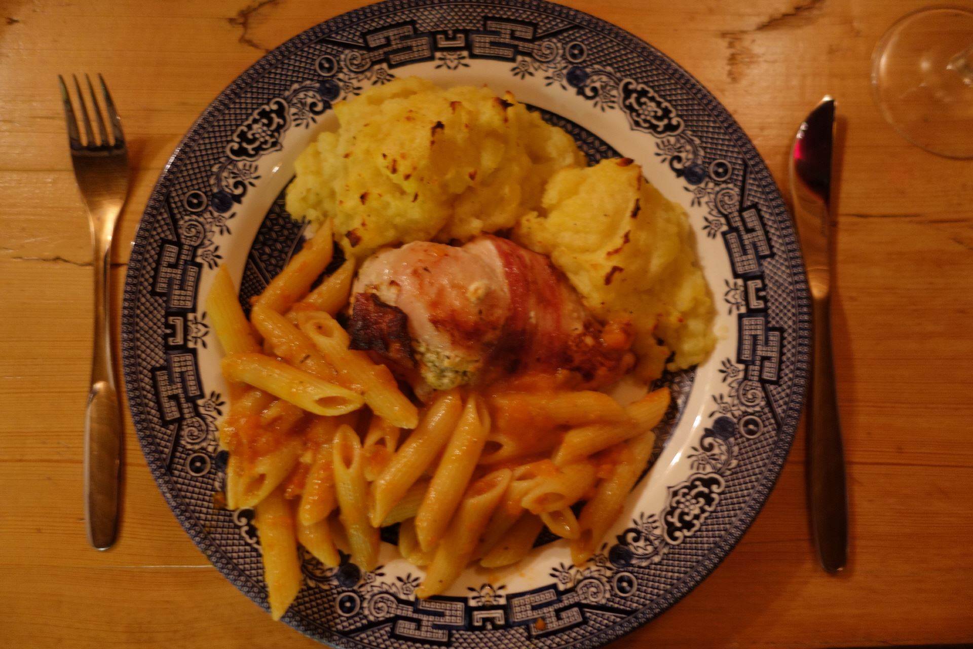 Es dauert etwas länger als auch schon, dann wird endlich ein Nachtessen serviert. Es gibt gefüllte Pouletbrüstchen, Penne mit hausgemachter Tomatensauce, dazu feine Kartoffelpuffer aus dem Ofen.
