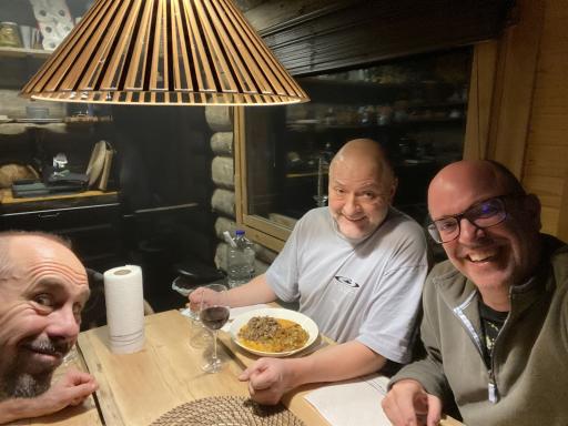 Ivo hat ein weiters Mal in der Küche gezaubert: Rentiergeschnetzeltes und eine selbstgeraffelte, wunderbar knusprige Rösti. Dazu noch den letzten Rest vom äusserst feinen Shiraz des Vorabends.