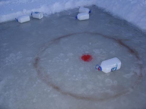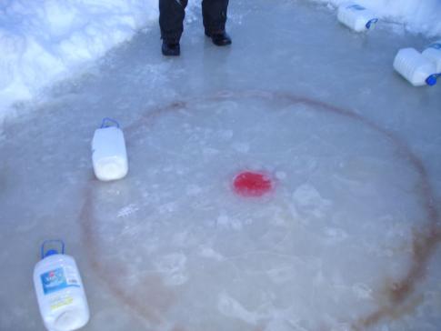 Hier noch eine technische Erläuterung zu unserem äusserst professionellen Curlingfeld: Der rote Punkt ist ein Teller vom Original Kelohovigeschirr und den Kreis haben wir mit einer umweltfreundlichen Mischung aus Ovopulver und Sojasauce in die Eisschicht eingefroren. |