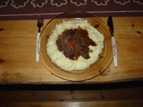Dafür zauberte Ivo heute was ganz Besonderes auf den Tisch: 2,5 Kilo Rentierfleisch von Maarti Salanki welches 2 Stunden im Römertopf geschmort hatte auf hausgemachtem Kartoffelstock! Ja allein dafür lohnt sich der Weg hier hoch! |