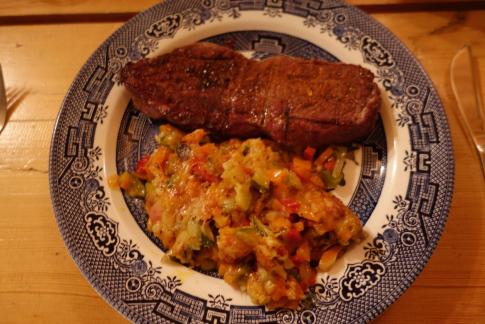 Kurz nach Filmende lassen wir uns den Gemüseauflauf und ein sehr gutes Stück Steak von Rind im Gaumen zergehen. Ein Briego Ribera del Duero passt vorzüglich zu diesem leckeren Menu.