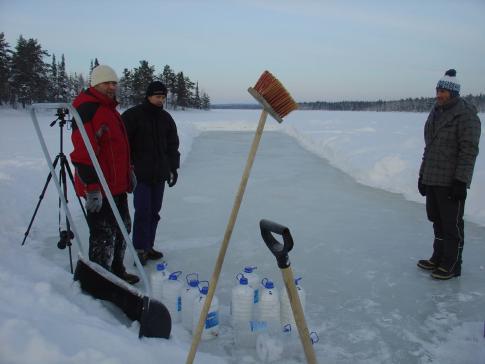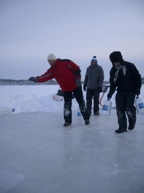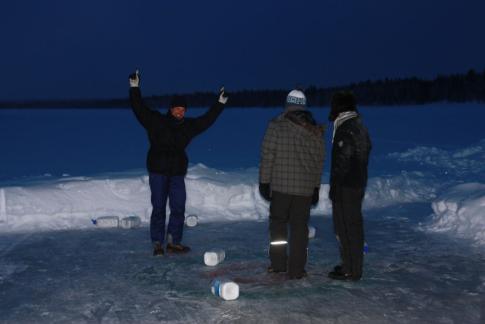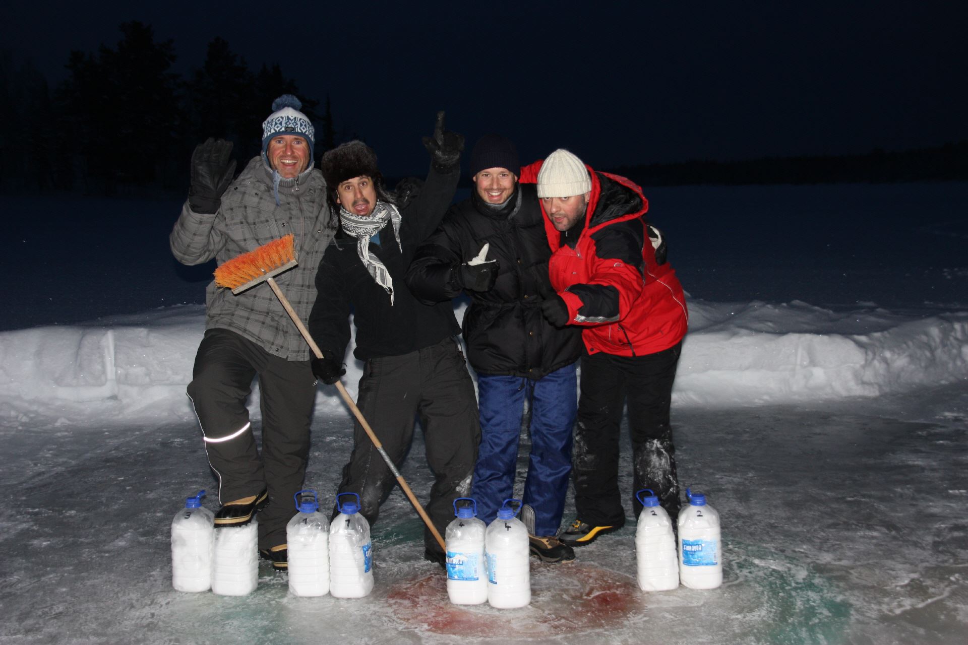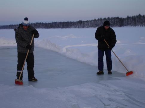 Es sind nur noch wenige Minuten bis die ersten Steine übers wahrscheinlich beste Curlingfeld Lapplands auf der frisch polierten Eisfläche gleiten. Das Spektakel kann beginnen. |